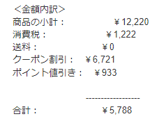 通常販売価格では13,420円(税込み)ですが、株主優待(クーポン割引部分)とポイントを使用したところ、5,788円(税込み)と半額以下で購入することができました。